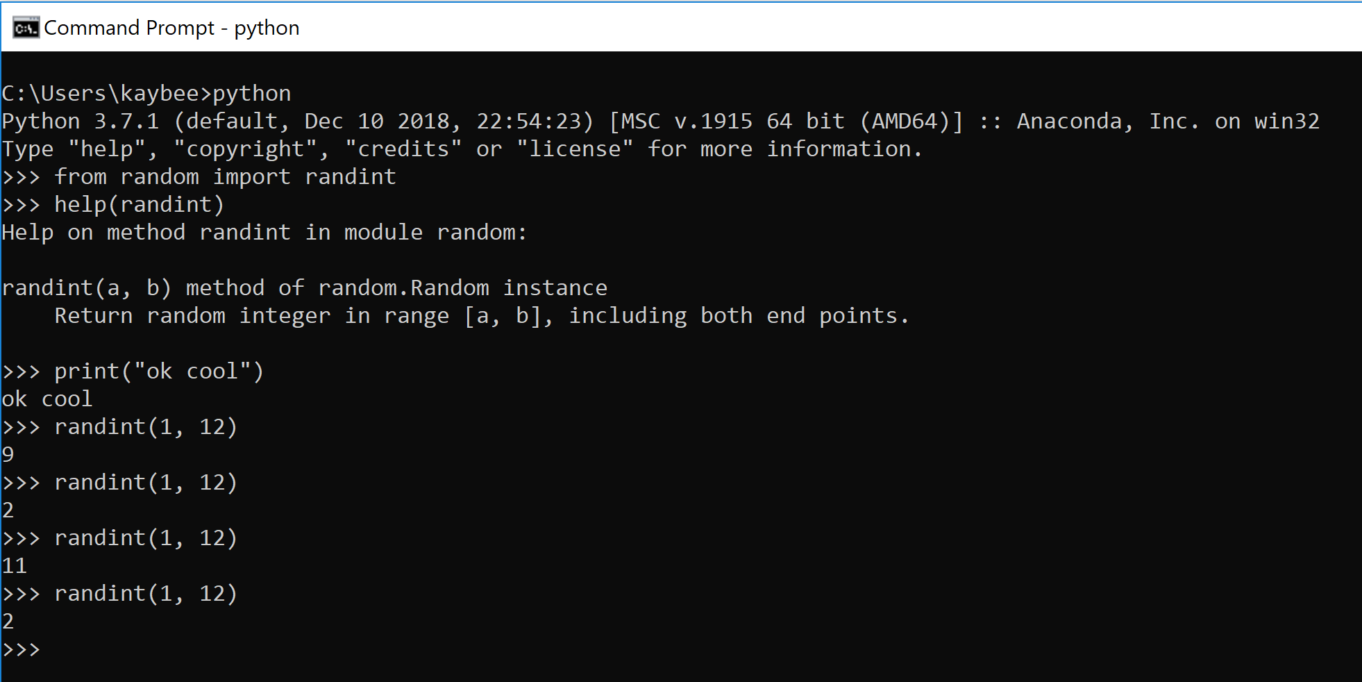 >>>randint(1, 12)You may get a 2, an 11, and another 2. But what if I rolled the di 1000 times? I know, why would I do that? It would take forever. Computers are good at doing the same thing over and over real fast. Let’s have the computer do it.