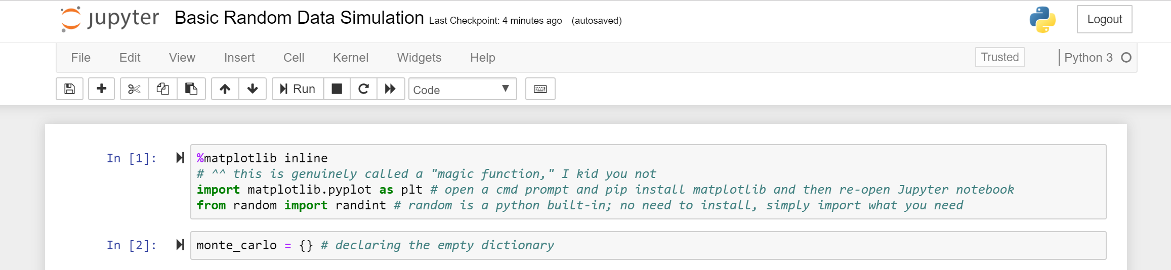 All the code for this exercise can be found here under the folder MonteCarlo. This exercise is called Basic Random Data Simulation.