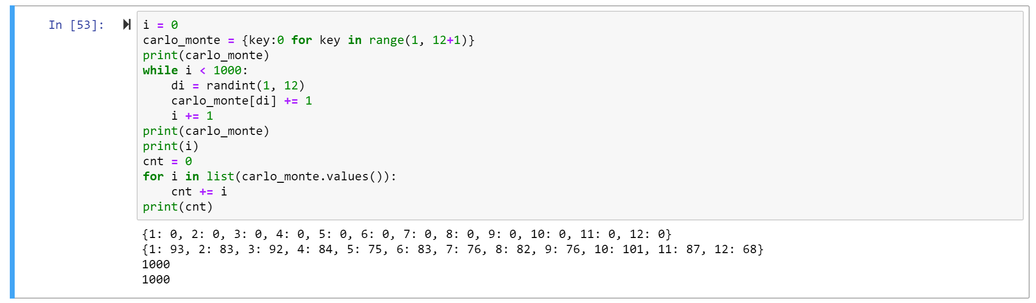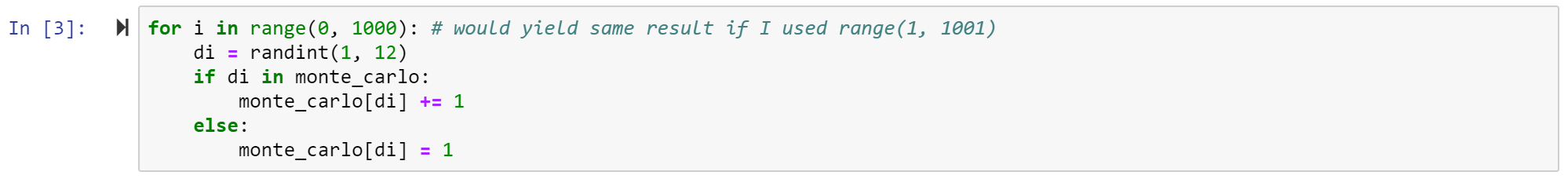 Note that in the first few rolls, the else statement will definitely be executed to initialized all the values, but by the time we reach the end of the 1000 runs, all 12 keys will likely exist. At some point, the else statement will be ignored for the remainder of the loop. A while loop would have worked, too.