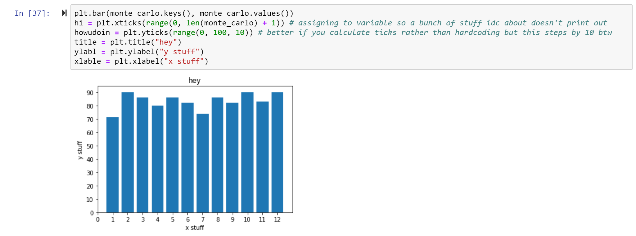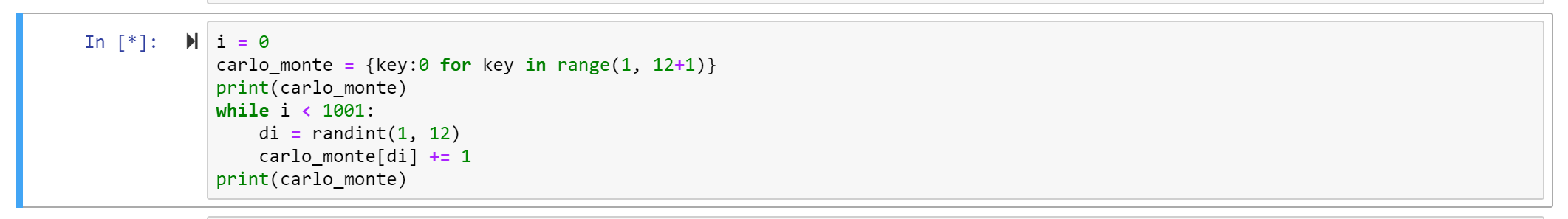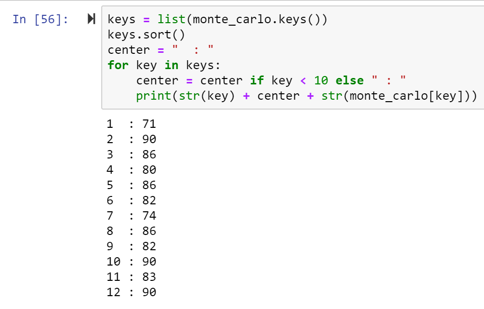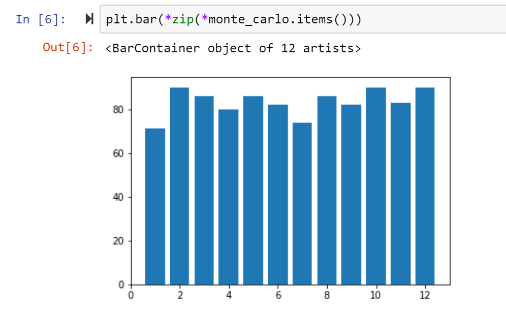 The dictionary monte_carlo will store our data. The keys will coordinate with each side of the 12-sided di. So there will be 12 keys (1, 2, 3, …, 12).